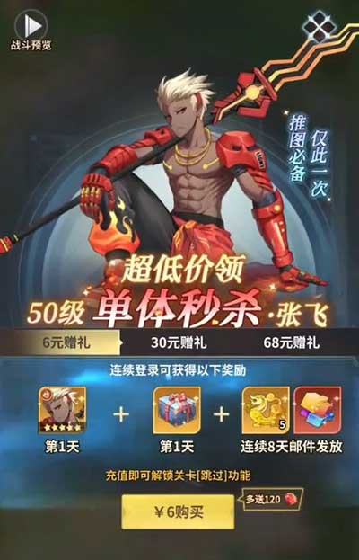 开启之后大家要做的第一件事就是去找游戏的首充礼包,然后购买该礼包,这礼包中有一位金色品质的五星武将,还有不少材料和抽奖卷性价比极高,因此可以去购买,在购买后队伍中就会拥有两位金色品质角色,之后需要去继续提升这两位的战斗力,如此自身队伍的整体质量就会提升,随后就可以开始攻略第三章的主线了。这章主线在有了这两位金色角色的加持后就可以推完了,推完后队伍整体的等级上限会得到提升,随后整体战力也会上去,之后就可以去打活动了。