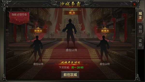 活动开启,先要组织行会成员攻入龙城皇宫,摧毁城中央金色城主雕像,活动开启30分钟后进入城主殿,争夺归属权,当皇宫地图中只有本行会的成员,即临时占领皇城,直至活动结束,结束时占领皇城的行会最终获得胜利,成为龙城霸主!