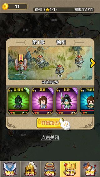4、点击关卡,开始闯关,征战三国;