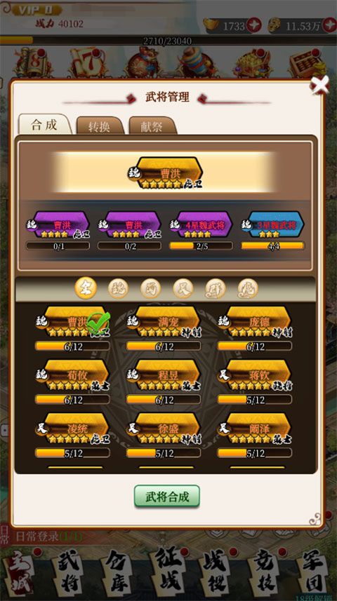 要注意的是上阵中的武将是无法添加至合成材料的哦,需要手下添加至材料哦!
