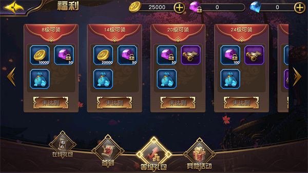 等级礼包:角色达到指定等级即可领取,绑定钻石、晶石、游戏币以及珍贵的奥义密卷让你拿到手软!