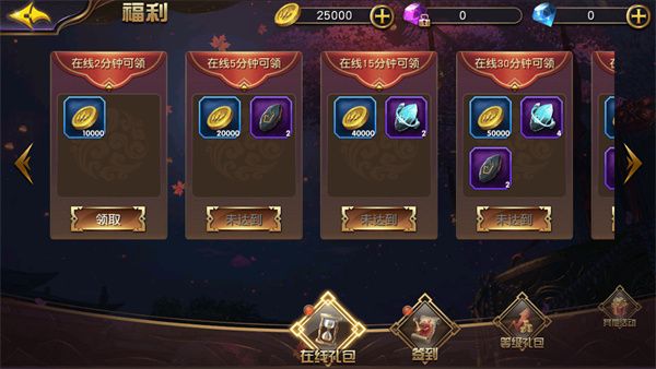 在游戏中可点击“福利”按钮,福利界面包含游戏中所有的福利活动,其中在线礼包,只要达到相应的在线时间即可领取;