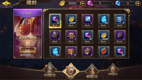 签到奖励:每天签到一次即可领取奖励,其中包含绑定钻石、金币、强化石、晶石、坐骑食材等道具。