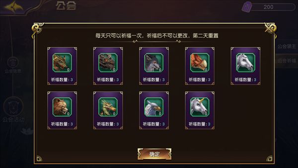 公会祈愿:当玩家加入了公会后,可以前往公会界面——公会活动——祈愿,进入祈愿界面可以选择祈福坐骑魂魄。玩家可以使用一定数量的坐骑魂魄对坐骑进行进阶操作。
