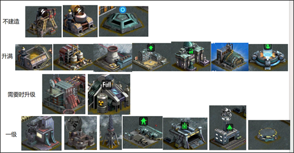-功能型建筑,主要包括:指挥中心,英雄祭台,英雄竞技场,英雄底座,兵营,战车工厂,空指部,武器中心,步兵训练营,作战实验室,防御实验室,地雷工厂。指挥中心以最快速度升到三级,因为三级可以解锁大部分科技,而且可以出战三个英雄,也可以升四级指挥部,出战五个英雄,但是前期不推荐。英雄祭台只要能升级就升,因为可以减少英雄复活时间。步兵训练营,作战实验室,防御实验室,地雷工厂这四个能升级就升级,他们是解锁科技的必要条件。英雄底座,兵营,战车工厂,空指部,武器中心这五个一级就足够,不推荐升级。战车回收站不建议建造。