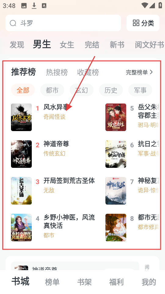 1、打开APP,在榜单区域找到目标小说,比如【风水异事】,点击进入小说详情页啦。