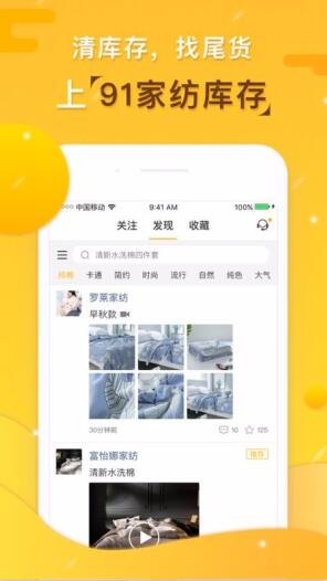 3、搜索库存商品动态,在发现栏目下点击搜索功能可以输入关键词搜索家纺产品去操作。