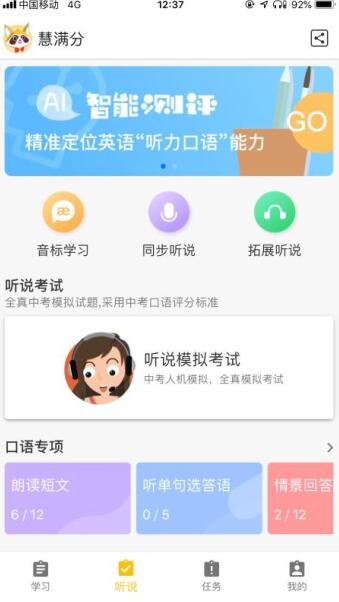 3、为用户提供智能评测功能,可以在线进行听说口语评测,了解自己英语听说能力。