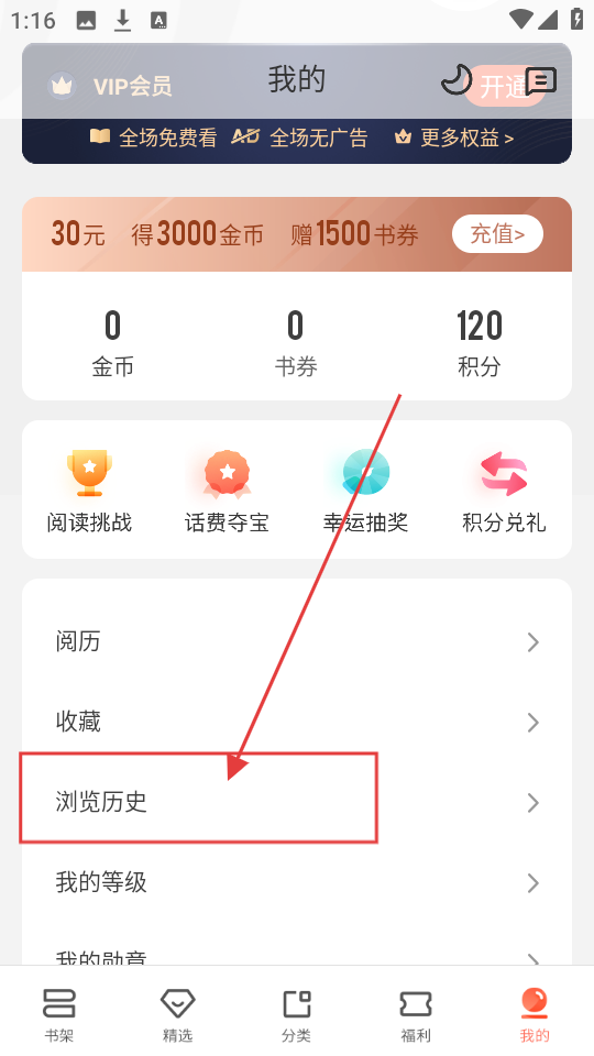 2、在个人中心页面,找到【浏览历史】选项,点击它,进入阅读记录页面,查看阅读过的小说哦。