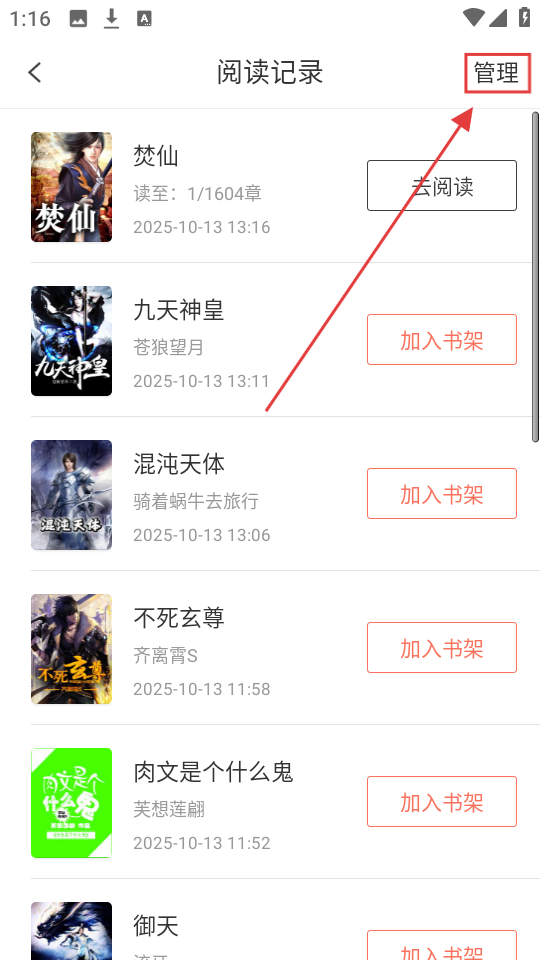 3、在阅读记录页面,点击右上角【管理】按钮,进入阅读记录管理模式,以便选择要操作的记录啦。