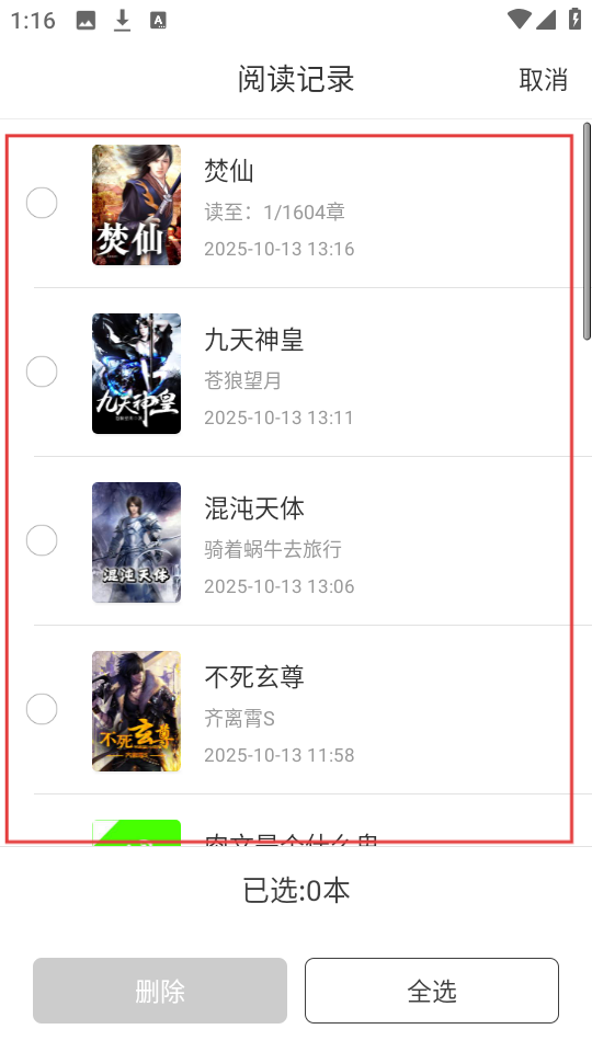 4、进入管理模式后,可勾选阅读记录中的小说,进行删除等操作,轻松管理阅读记录啦。