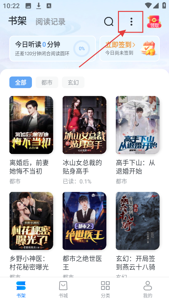 1、在“书架”页面,若想使用更多功能,点击右上角的三点按钮,就能展开功能菜单啦。