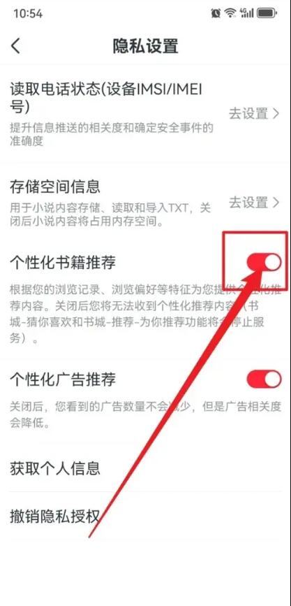 4、进入隐私设置界面,打开【个性化书籍推荐】右侧的开关。