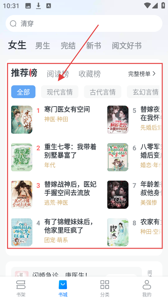 1、在“书城”页面,能看到各类榜单的书籍推荐,若想查看某本书,点击对应的书籍就行啦。