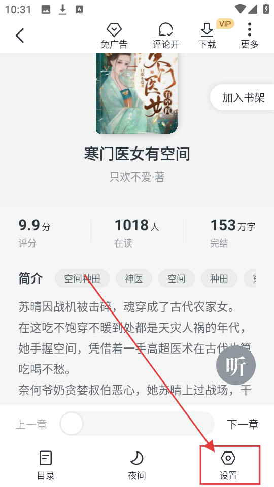 2、进入书籍详情页面后,若想调整阅读设置,点击【设置】按钮,就能展开设置选项啦。