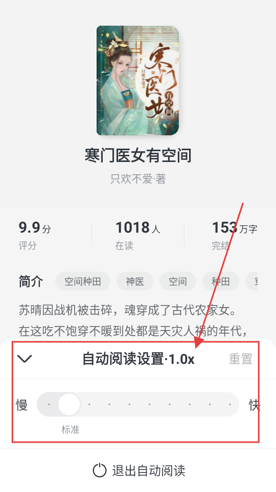 4、进入自动阅读设置后,可调整阅读速度等,方便更舒适地进行自动阅读哦。