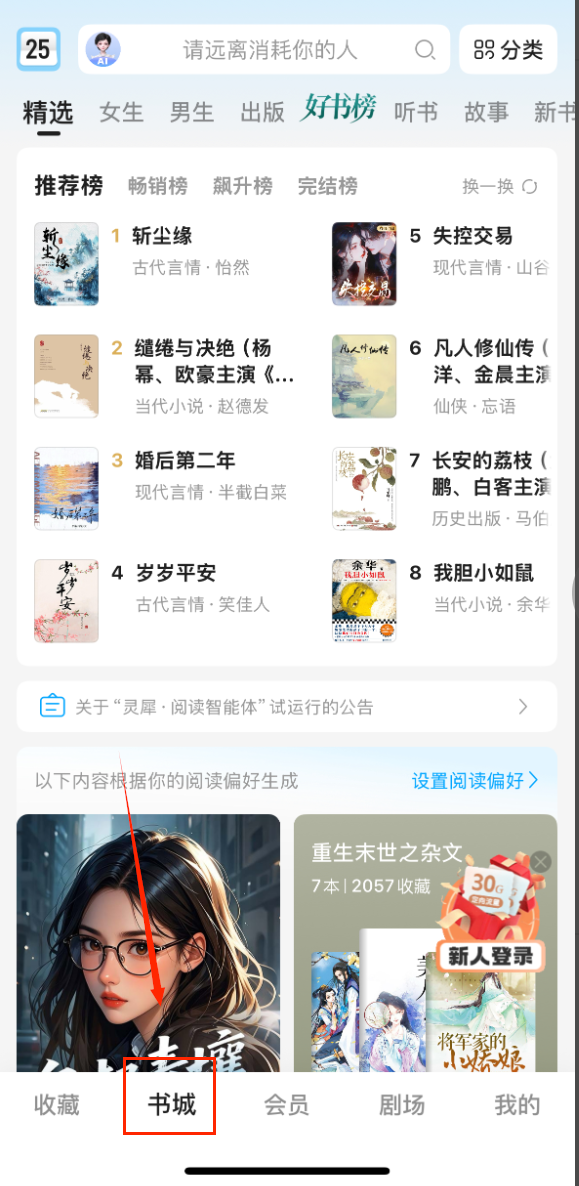 1、进入主界面后可浏览推荐书目或通过分类查找感兴趣的内容,新用户可领取体验会员享受免费阅读权益,各类资源清晰展示便于快速选择。