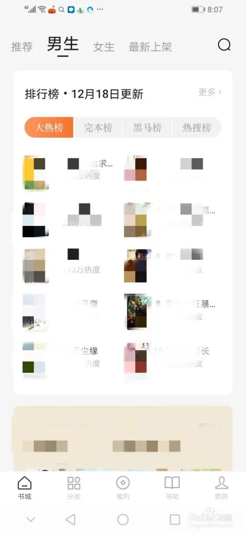 打开客户端之后,进入到的是书城界面,书城界面里的小说是按照排行榜单排序,有大热榜、完本榜、黑马榜、热搜榜等等。我们可以在这里找大家都爱看的小说。