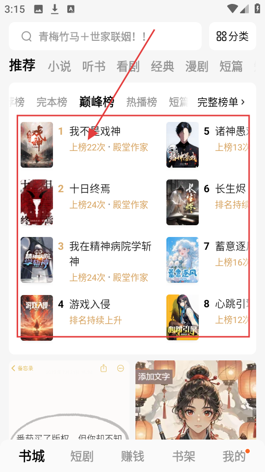 1、在书城【巅峰榜】里,有超多热门作品,选感兴趣的点击,就能进入阅读或了解详情,超棒的呢。