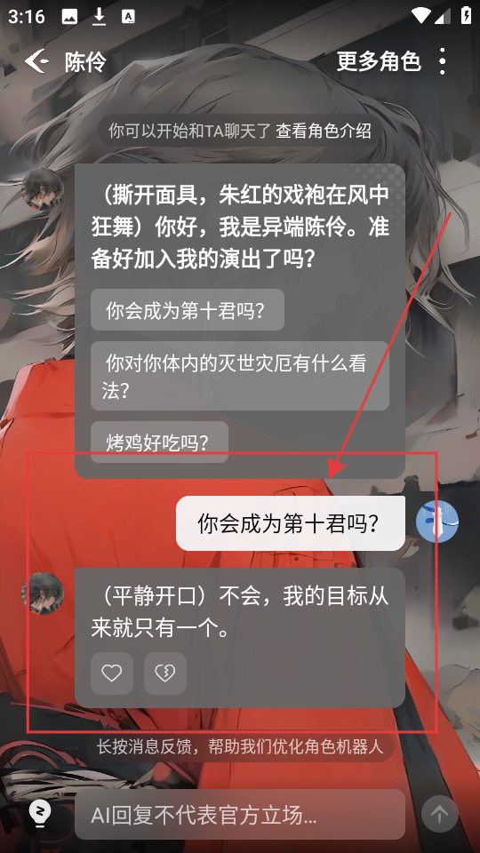 3、进入角色对话界面,会有预设问题,选一个发送,就能和角色聊天,探索故事,很有意思哟。