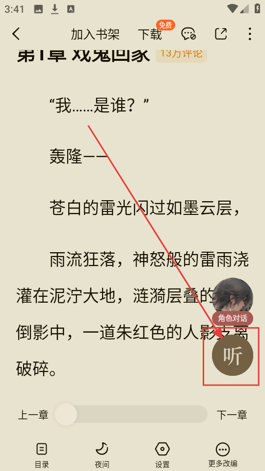 打开番茄免费小说app,在书籍阅读页面找到“听”按钮,点击进入。