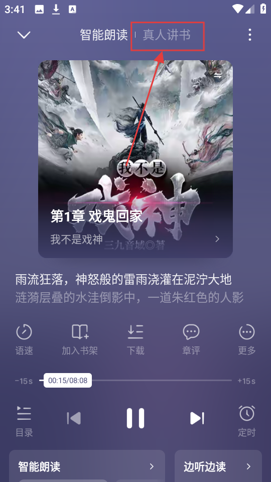 3、点击切换到【真人讲书】模式,能体验更生动的讲书效果,让听书更有沉浸感。