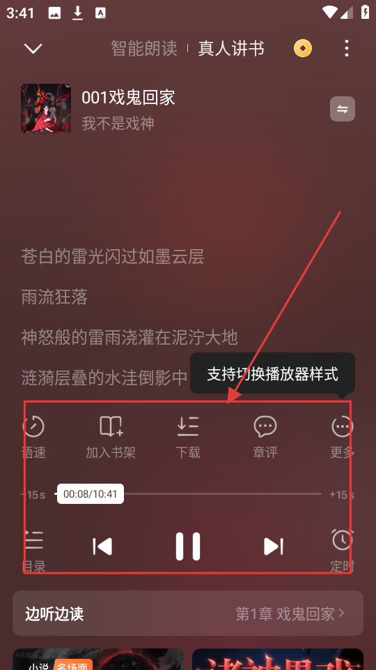 4、在真人讲书界面,可切换播放器样式,还能调整语速等,打造专属听书体验。