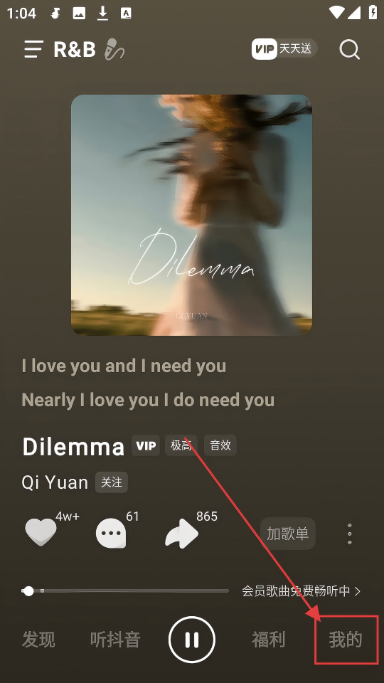 1、在APP播放歌曲页面,点击底部【我的】,能进入个人中心页面,超方便的。