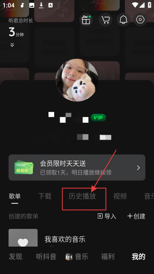 2、在个人中心页面,有【历史播放】选项,点击它,可查看之前听过的歌曲,超实用的。