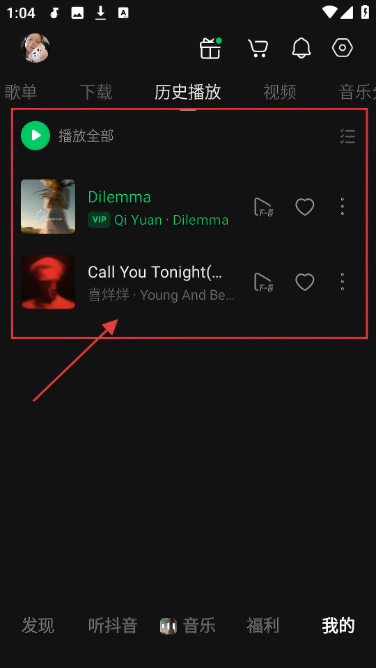 3、进入【历史播放】页面,能看到之前听过的歌曲列表,像【Dilemma】等,方便快速找到想听的歌哦。