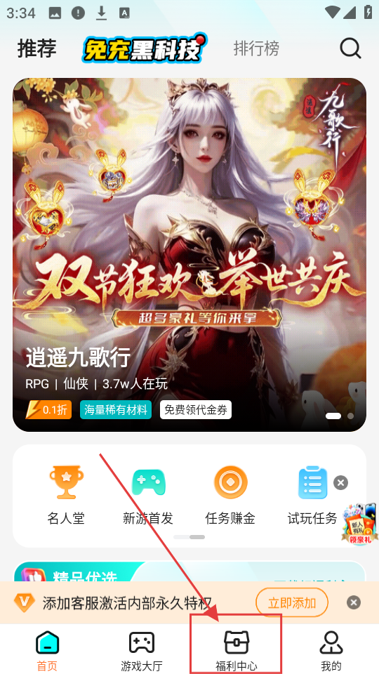 1、进入软件首页,若想查看福利相关,就点击底部【福利中心】按钮,进入福利中心页面。