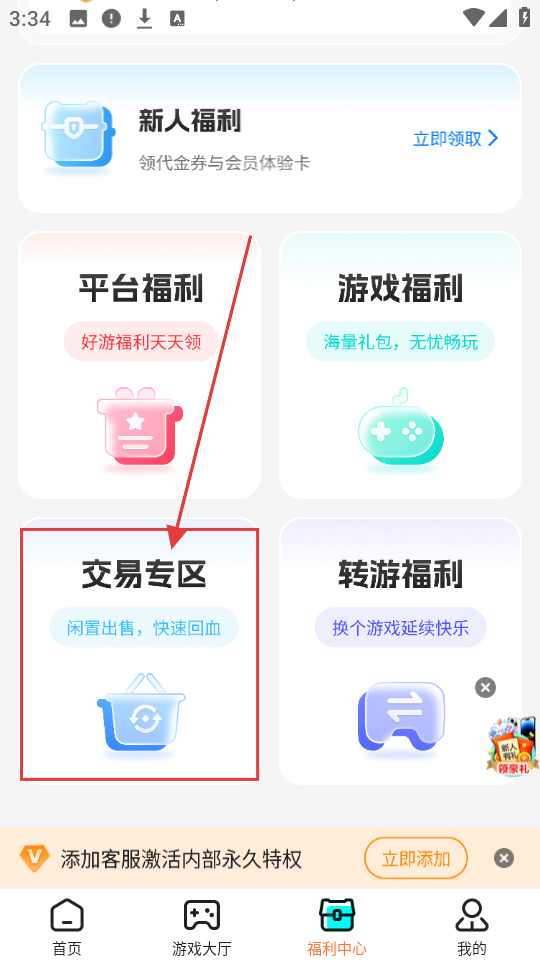2、到福利中心页面,若想进行交易相关操作,就点击【交易专区】选项,进入交易专区页面。