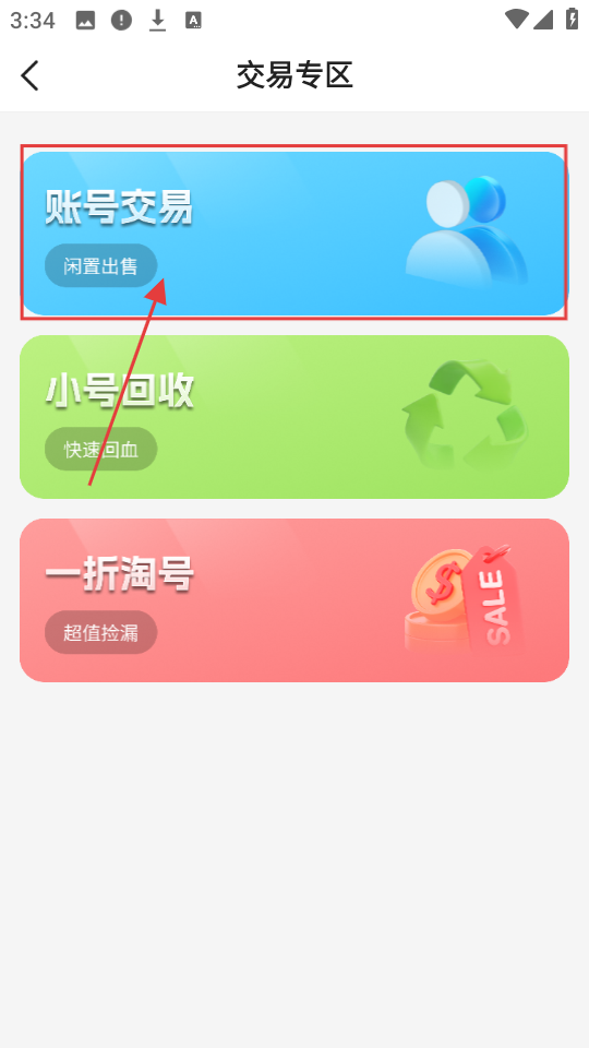 3、在交易专区页面,若想进行账号交易,就点击【账号交易】选项,进入账号交易页面。