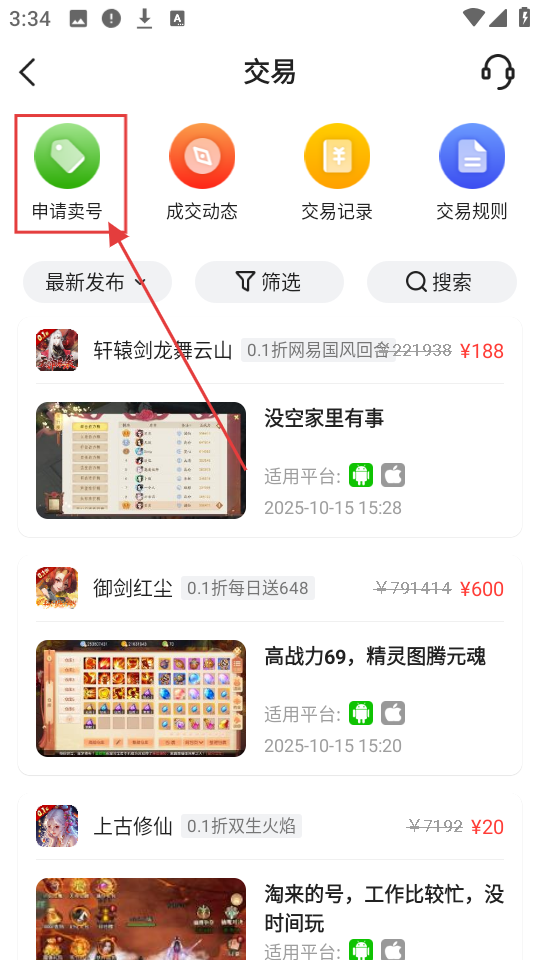 4、到账号交易页面,若想申请卖号,就点击【申请卖号】按钮,开始卖号流程。