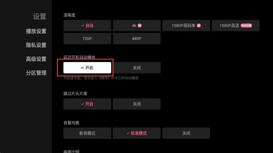 3、在设置页面的播放设置中,找到【延迟开机自动播放】选项,可选择开启或关闭状态呢。