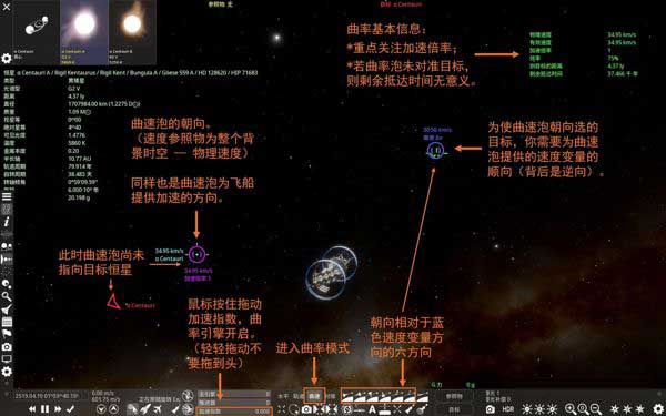 同步速度可以自动帮我们将曲速泡指向目标,这一过程可能需要一定时间,因此请确保飞船远离周围大型天体。为避免干扰视线,可随意点击远处将参照物设置为空。