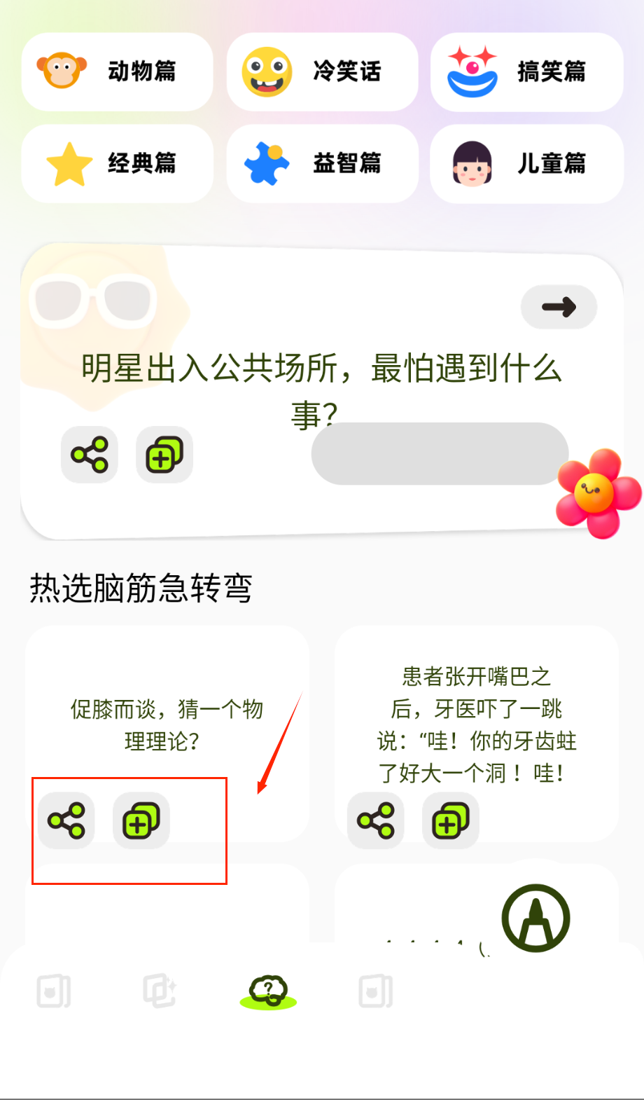 1、在脑筋急转弯题目下方找到分享图标,点击后选择社交平台发送题目邀请好友答题,评论区可以发表自己的答案或看法交流思路。