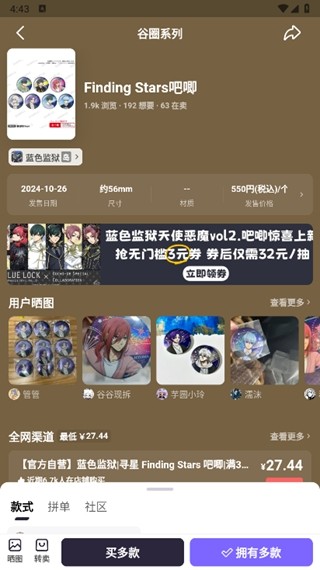 4、我们随便点击一个具体的商品,进入商品页,可以看到很多已经上架的二手,可以购买,或者点击下方转卖上架自己的商品。如果不想这么麻烦点击找,也可以直接在首页搜索谷子的名字,也能到达对应位置。