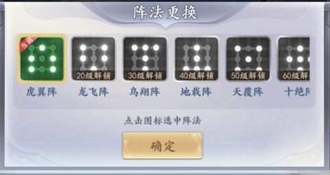 玩家可以选择五种阵法进行布阵,分别是虎翼阵,龙飞阵,鸟翔阵,地裁阵,天覆阵、十绝阵。