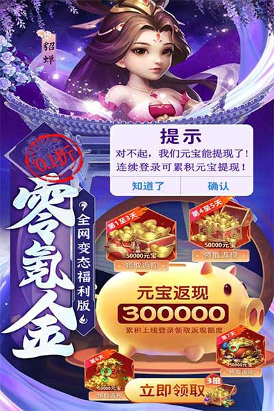 全面降价充值,首次充值仅需0.06,原价648只需要6.48!现推出难以置信的0.1折充值福利活动,让您以微薄的代价享受丰厚的回报!这是一个绝佳的机会,让您在游戏中飞跃发展,成就一番三国霸业!通过参与0.1折充值活动,您将获得大量黄金、稀有红将和绝世珍贵装备!每天还送10万充值币,上线还有免费999连抽,不用再精打细算等活动,主打一个优解性价比,直接无脑冲冲冲!