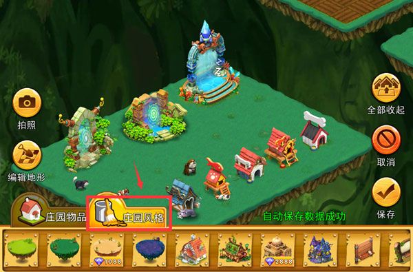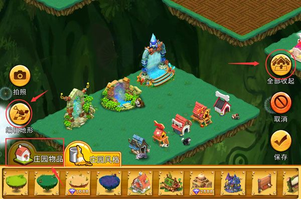 ③【全部收起】后,所有物品都暂时存放在【庄园物品】栏内,摆放的时候拖拽到庄园上即可(注意:全部摆放完毕后才能保存哦!!!所以想要全部收起还是要一定勇气的~)