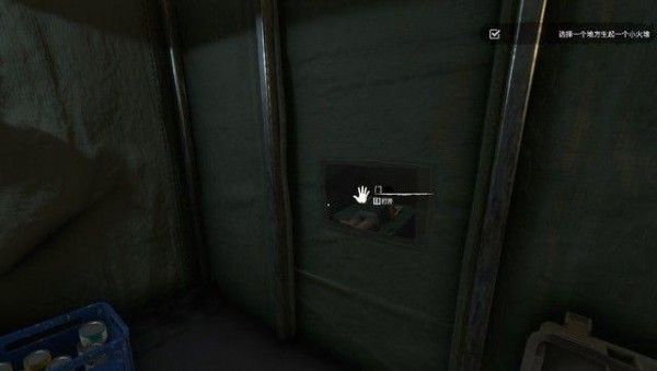 出帐篷,首先我们需要一把刀才能继续,如下图箭头所指,门口的箱子里面就有刀。
