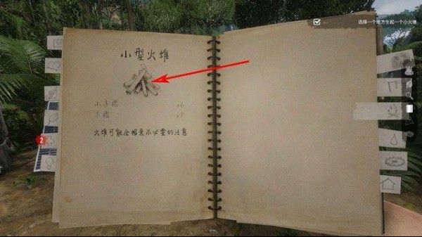 呼出日记界面,点击右侧的火焰图标,然后点击如下图箭头所指的小火堆图标,将小火堆蓝图放在地上任意位置。