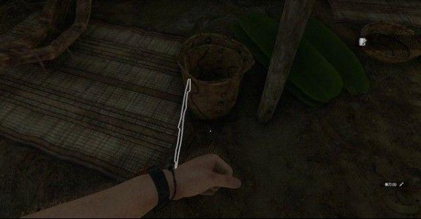 第二天醒来的时候,发现老婆不见了,使用步话机联系老婆,她居然一个人独自去找野人部落了。如下图箭头所指,在帐篷里的桌子上有字条,读字条继续剧情。老婆告诉你,桌上有送给你的礼物,这是一个多功能手表,可以定位,也可以查看角色状态。