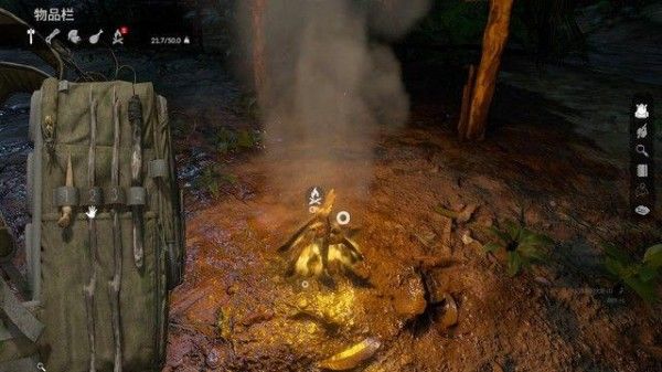 过河之后再继续往前走就可以找到一个废弃的原始部落。这里可以当做是一个基地。如下图箭头所指,在废弃的火坑里面可以找到烧毁的背包,里面有地图,接下调查地点的任务。