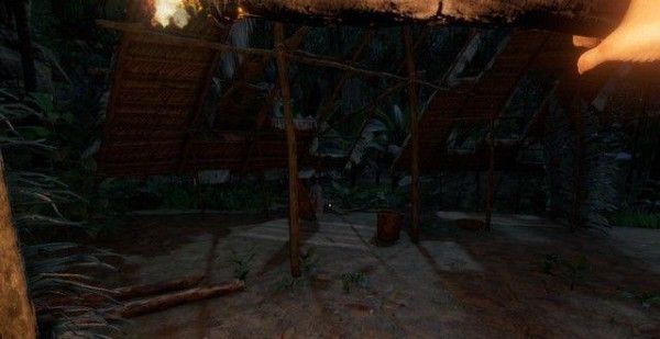 可是,由于工作量较大,我们的石刀很快就坏了。去部落废墟的吊床那里,如下图,在桶旁边有骨刀,这是一种耐久度远比石刀优秀的武器。接下来就去砍树吧。