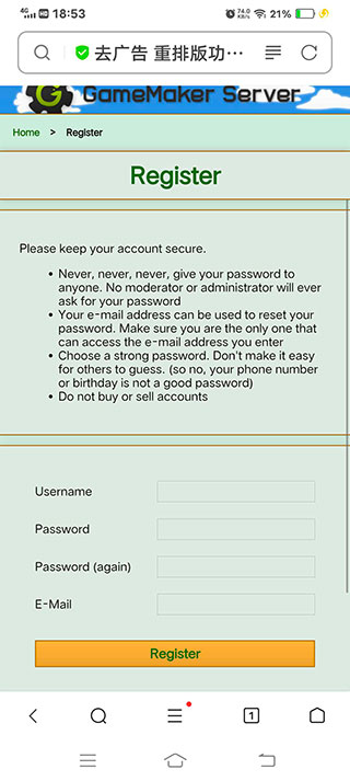 3、根据紫色方框中给的网址在浏览器上输入一下地址:gamemakerserver.com/en/register。