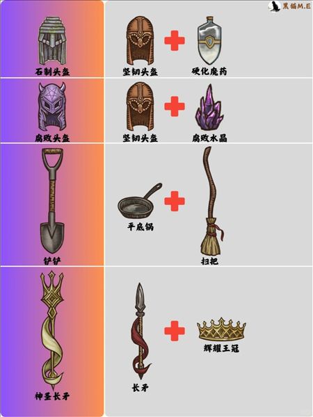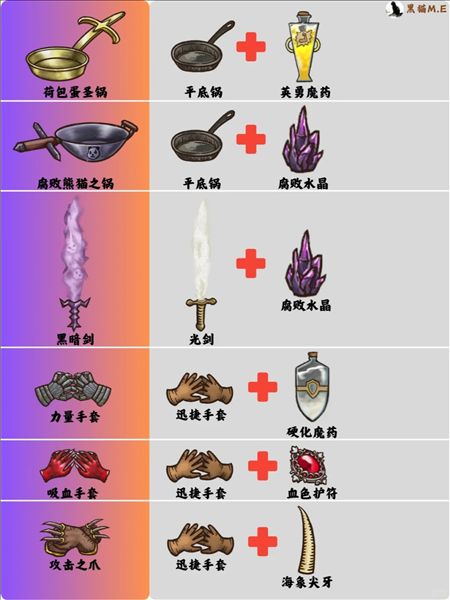 木剑可以衍生出勇者之剑,而平底锅可以衍生出尖刺盾牌。合理选择融合物品,以提高角色的战斗能力。