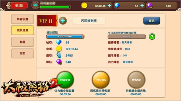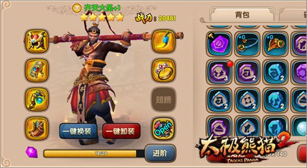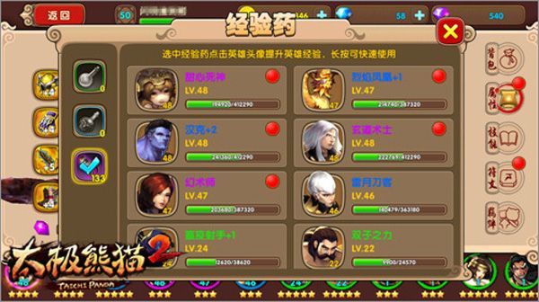 太极熊猫2游戏中丰富的英雄以及多角色切换设定无疑是大大提高了游戏的可玩性。游戏中每天世界boss活动也会随机指定一个英雄提升500%的伤害,从一定程度上鼓励大家体验不同英雄的乐趣。然而,普通玩家的资源很有限,主将装备在强化和精炼等级上远远高于其它副将,且不同的主将会有不同的装备搭配,尤其是在物理系和法系英雄之间切换。