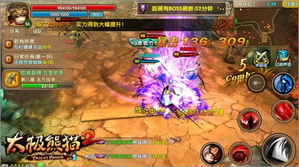 太极熊猫2游戏还具有神秘和挑战性的野外玩法,全面平衡模式,使得玩家可以在地宫中PK群战、争夺BOSS、挑战精英怪和采集各种宝箱,产出稀有红色神装、天马飞行坐骑等,同时地宫产出物品还可在拍卖行进行交易,更有全新组队副本和大世界地图等玩家来探索!